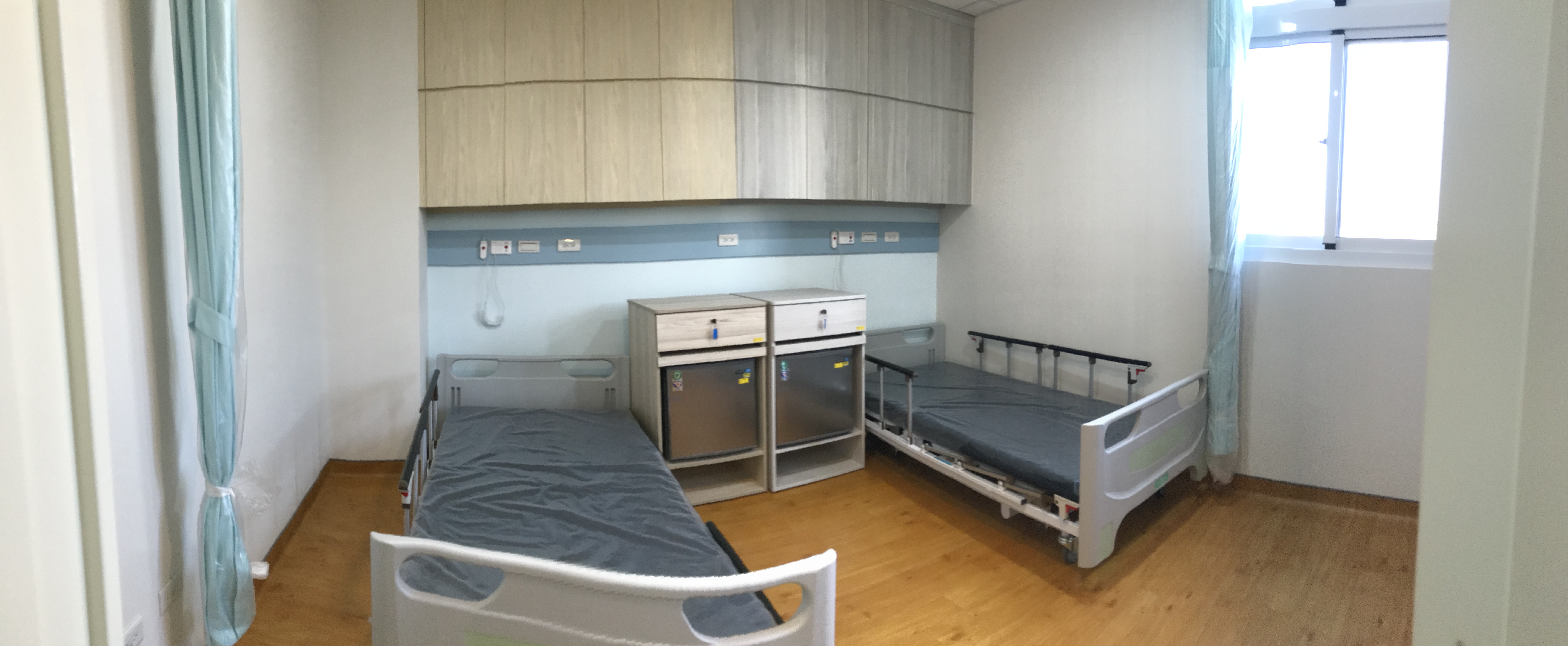 溫馨的雙人房 每個房間採套房設計,有獨立的無障礙浴廁。 每個房間都有對外窗戶,且獨立冷暖空調, 避免中央空調病毒細菌交互流通。 使用三段式電動床,依照個人需求調整舒適擺位。 如飯店般備有個人小冰箱,方便儲藏個人食物。